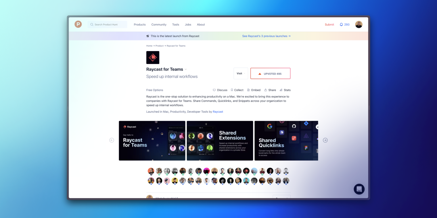 At the midway stage of Launch Week, we officially launched Raycast for Teams out of beta, allowing companies to start using Raycast in their teams. Our launch started on Product Hunt, where we reached the 4th Product of the Day with 500 upvotes!