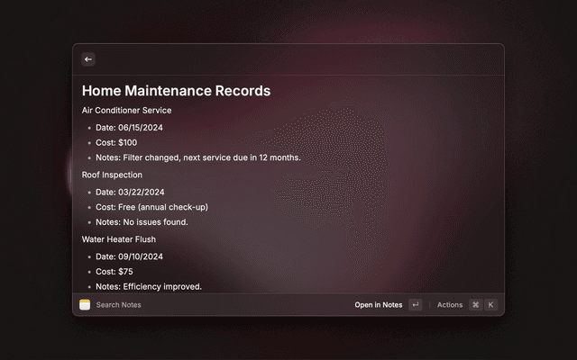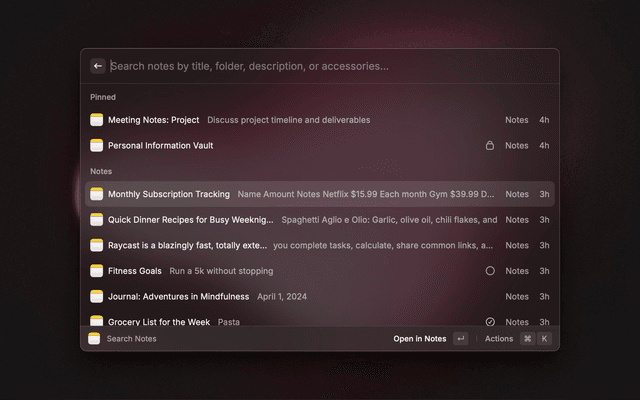 Search for and create Apple Notes directly within Raycast.