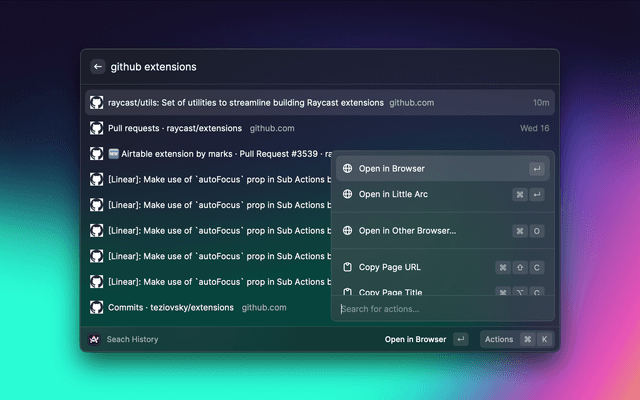 Search and quickly navigate your Arc browser's history and open tabs. You can open recent tabs in Arc or Little Arc as well as copy websites to quickly share them.